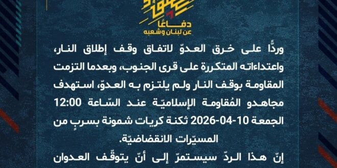 دفاعًا عن لبنان وشعبه، وردًّا على خرق العدوّ لاتفاق وقف إطلاق النار، واعتداءاته المتكررة على قرى الجنوب، وبعدما التزمت المقاومة بوقف النار ولم يلتزم به العدوّ، استهدف مجاهدو المُقاومة الإسلاميّة عند السّاعة 12:00 الجمعة 10-04-2026 ثكنة كريات شمونة بسربٍ من المسيّرات الانقضاضيّة.
