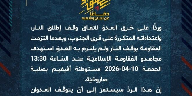 دفاعًا عن لبنان وشعبه، وردًّا على خرق العدوّ لاتفاق وقف إطلاق النار، واعتداءاته المتكررة على قرى الجنوب، وبعدما التزمت المقاومة بوقف النار ولم يلتزم به العدوّ، استهدف مجاهدو المُقاومة الإسلاميّة عند السّاعة 13:30 الجمعة 10-04-2026 مستوطنة أفيفيم بصلية صاروخيّة.