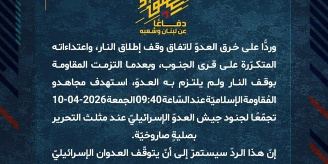 دفاعًا عن لبنان وشعبه، وردًّا على خرق العدوّ لاتفاق وقف إطلاق النار، واعتداءاته المتكرّرة على قرى الجنوب، وبعدما التزمت المقاومة بوقف النار ولم يلتزم به العدوّ، استهدف مجاهدو المُقاومة الإسلاميّة عند السّاعة 09:40 الجمعة 10-04-2026 تجمّعًا لجنود جيش العدوّ الإسرائيليّ عند مثلث التحرير على أطراف مدينة بنت جبيل بصليةٍ صاروخيّة.