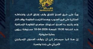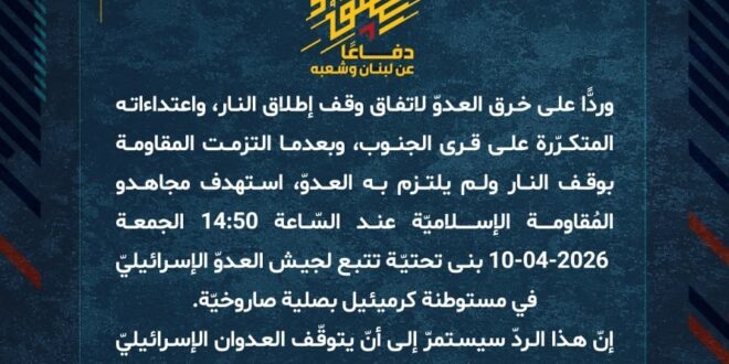 دفاعًا عن لبنان وشعبه، وردًّا على خرق العدوّ لاتفاق وقف إطلاق النار، واعتداءاته المتكرّرة على قرى الجنوب، وبعدما التزمت المقاومة بوقف النار ولم يلتزم به العدوّ، استهدف مجاهدو المُقاومة الإسلاميّة عند السّاعة 14:50 الجمعة 10-04-2026 بنى تحتيّة تتبع لجيش العدوّ الإسرائيليّ في مستوطنة كرميئيل بصلية صاروخيّة.