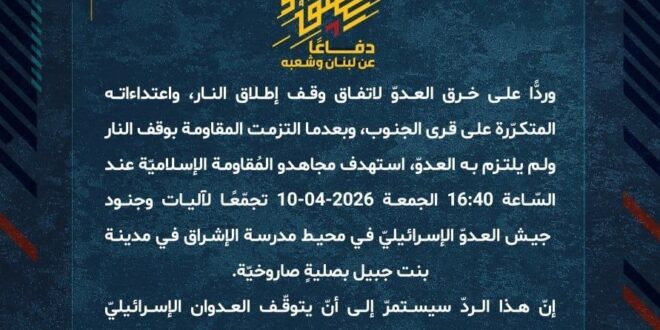 دفاعًا عن لبنان وشعبه، وردًّا على خرق العدوّ لاتفاق وقف إطلاق النار، واعتداءاته المتكرّرة على قرى الجنوب، وبعدما التزمت المقاومة بوقف النار ولم يلتزم به العدوّ، استهدف مجاهدو المُقاومة الإسلاميّة عند السّاعة 16:40 الجمعة 10-04-2026 تجمّعًا لآليات وجنود جيش العدوّ الإسرائيليّ في محيط مدرسة الإشراق في مدينة بنت جبيل بصليةٍ صاروخيّة.