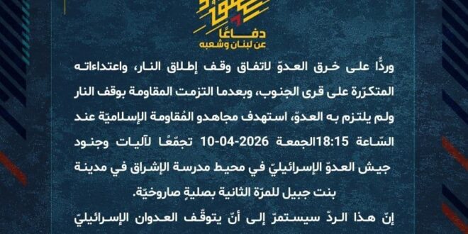 دفاعًا عن لبنان وشعبه، وردًّا على خرق العدوّ لاتفاق وقف إطلاق النار، واعتداءاته المتكرّرة على قرى الجنوب، وبعدما التزمت المقاومة بوقف النار ولم يلتزم به العدوّ، استهدف مجاهدو المُقاومة الإسلاميّة عند السّاعة 18:15 الجمعة 10-04-2026 تجمّعًا لآليات وجنود جيش العدوّ الإسرائيليّ في محيط مدرسة الإشراق في مدينة بنت جبيل للمرّة الثانية بصليةٍ صاروخيّة.