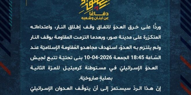 دفاعًا عن لبنان وشعبه، وردًّا على خرق العدوّ لاتفاق وقف إطلاق النار، واعتداءاته المتكرّرة على مدينة صور، وبعدما التزمت المقاومة بوقف النار ولم يلتزم به العدوّ، استهدف مجاهدو المُقاومة الإسلاميّة عند السّاعة 18:45 الجمعة 10-04-2026 بنى تحتيّة تتبع لجيش العدوّ الإسرائيليّ في مستوطنة كرميئيل للمرّة الثانية بصليةٍ صاروخيّة.