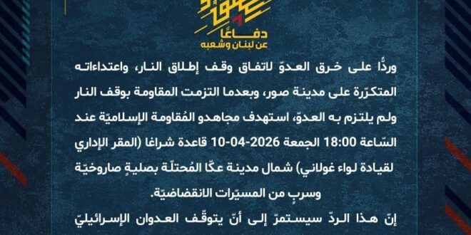 دفاعًا عن لبنان وشعبه، وردًّا على خرق العدوّ لاتفاق وقف إطلاق النار، واعتداءاته المتكرّرة على مدينة صور، وبعدما التزمت المقاومة بوقف النار ولم يلتزم به العدوّ، استهدف مجاهدو المُقاومة الإسلاميّة عند السّاعة 18:00 الجمعة 10-04-2026 قاعدة شراغا (المقر الإداري لقيادة لواء غولاني) شمال مدينة عكّا المُحتلّة بصليةٍ صاروخيّة وسربٍ من المسيّرات الانقضاضيّة.