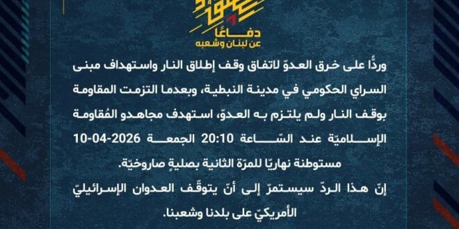 دفاعًا عن لبنان وشعبه، وردًّا على خرق العدوّ لاتفاق وقف إطلاق النار واستهداف مبنى السراي الحكومي في مدينة النبطية، وبعدما التزمت المقاومة بوقف النار ولم يلتزم به العدوّ، استهدف مجاهدو المُقاومة الإسلاميّة عند السّاعة 20:10 الجمعة 10-04-2026 مستوطنة نهاريّا للمرّة الثانية بصليةٍ صاروخيّة.