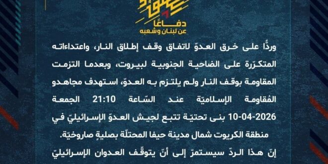 دفاعًا عن لبنان وشعبه، وردًّا على خرق العدوّ لاتفاق وقف إطلاق النار، واعتداءاته المتكرّرة على الضاحية الجنوبية لبيروت، وبعدما التزمت المقاومة بوقف النار ولم يلتزم به العدوّ، استهدف مجاهدو المُقاومة الإسلاميّة عند السّاعة 21:10 الجمعة 10-04-2026 بنى تحتيّة تتبع لجيش العدوّ الإسرائيليّ في منطقة الكريوت شمال مدينة حيفا المحتلّة بصليةٍ صاروخيّة.