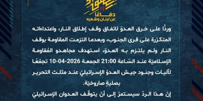 دفاعًا عن لبنان وشعبه، وردًّا على خرق العدوّ لاتفاق وقف إطلاق النار، واعتداءاته المتكرّرة على قرى الجنوب، وبعدما التزمت المقاومة بوقف النار ولم يلتزم به العدوّ، استهدف مجاهدو المُقاومة الإسلاميّة عند السّاعة 21:00 الجمعة 10-04-2026 تجمّعًا لآليات وجنود جيش العدوّ الإسرائيليّ عند مثلث التحرير بصليةٍ صاروخيّة.