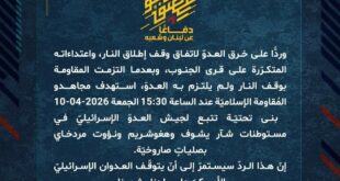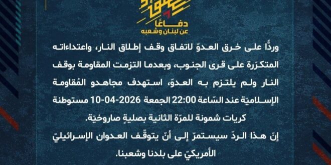 دفاعًا عن لبنان وشعبه، وردًّا على خرق العدوّ لاتفاق وقف إطلاق النار، واعتداءاته المتكرّرة على قرى الجنوب، وبعدما التزمت المقاومة بوقف النار ولم يلتزم به العدوّ، استهدف مجاهدو المُقاومة الإسلاميّة عند السّاعة 22:00 الجمعة 10-04-2026 مستوطنة كريات شمونة للمرّة الثانية بصليةٍ صاروخيّة.