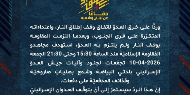 دفاعًا عن لبنان وشعبه، وردًّا على خرق العدوّ لاتفاق وقف إطلاق النار، واعتداءاته المتكرّرة على قرى الجنوب، وبعدما التزمت المقاومة بوقف النار ولم يلتزم به العدوّ، استهدف مجاهدو المُقاومة الإسلاميّة منذ الساعة 15:30 وحتى 21:30 الجمعة 10-04-2026 تجمّعات لجنود وآليات جيش العدوّ الإسرائيلي بلدتي البياضة وشمع بصلياتٍ صاروخيّة وقذائف المدفعيّة على دفعات.
