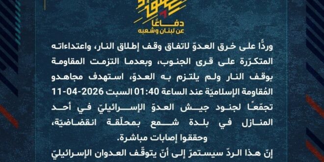 دفاعًا عن لبنان وشعبه، وردًّا على خرق العدوّ لاتفاق وقف إطلاق النار، واعتداءاته المتكرّرة على قرى الجنوب، وبعدما التزمت المقاومة بوقف النار ولم يلتزم به العدوّ، استهدف مجاهدو المُقاومة الإسلاميّة عند الساعة 01:40 السبت 11-04-2026 تجمّعًا لجنود جيش العدوّ الإسرائيليّ في أحد المنازل في بلدة شمع بمحلّقة انقضاضيّة، وحققوا إصابات مباشرة.