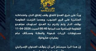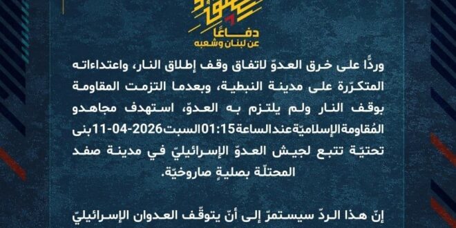 دفاعًا عن لبنان وشعبه، وردًّا على خرق العدوّ لاتفاق وقف إطلاق النار، واعتداءاته المتكرّرة على مدينة النبطية، وبعدما التزمت المقاومة بوقف النار ولم يلتزم به العدوّ، استهدف مجاهدو المُقاومة الإسلاميّة عند الساعة 01:15 السبت 11-04-2026 بنى تحتيّة تتبع لجيش العدوّ الإسرائيليّ في مدينة صفد المحتلّة بصليةٍ صاروخيّة.