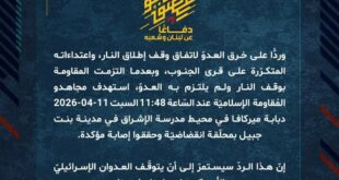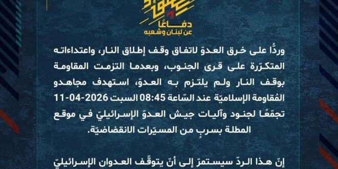 دفاعًا عن لبنان وشعبه، وردًّا على خرق العدوّ لاتفاق وقف إطلاق النار، واعتداءاته المتكرّرة على قرى الجنوب، وبعدما التزمت المقاومة بوقف النار ولم يلتزم به العدوّ، استهدف مجاهدو المُقاومة الإسلاميّة عند السّاعة 08:45 السبت 11-04-2026 تجمّعًا لجنود وآليات جيش العدوّ الإسرائيليّ في موقع المطلة بسربٍ من المسيّرات الانقضاضيّة.