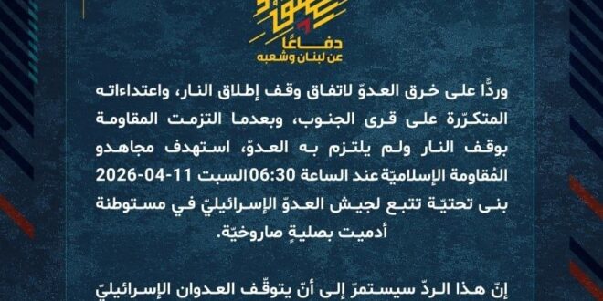 دفاعًا عن لبنان وشعبه، وردًّا على خرق العدوّ لاتفاق وقف إطلاق النار، واعتداءاته المتكرّرة على قرى الجنوب، وبعدما التزمت المقاومة بوقف النار ولم يلتزم به العدوّ، استهدف مجاهدو المُقاومة الإسلاميّة عند الساعة 06:30 السبت 11-04-2026 بنى تحتيّة تتبع لجيش العدوّ الإسرائيليّ في مستوطنة أدميت بصليةٍ صاروخيّة.