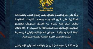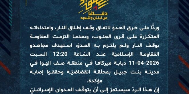 دفاعًا عن لبنان وشعبه، وردًّا على خرق العدوّ لاتفاق وقف إطلاق النار، واعتداءاته المتكرّرة على قرى الجنوب، وبعدما التزمت المقاومة بوقف النار ولم يلتزم به العدوّ، استهدف مجاهدو المُقاومة الإسلاميّة عند السّاعة 12:20 السبت 11-04-2026 دبابة ميركافا في منطقة صف الهوا في مدينة بنت جبيل بمحلّقة انقضاضيّة وحققوا إصابة مؤكدة.