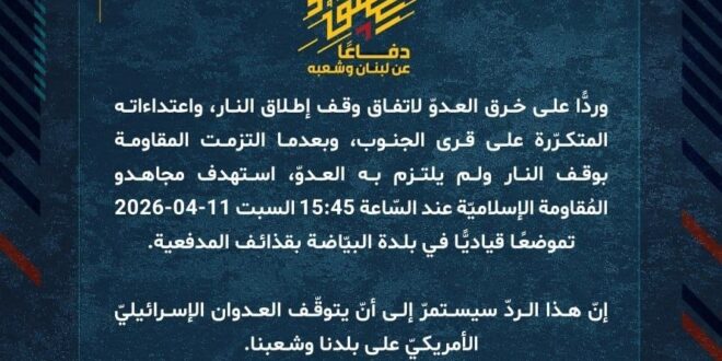 دفاعًا عن لبنان وشعبه، وردًّا على خرق العدوّ لاتفاق وقف إطلاق النار، واعتداءاته المتكرّرة على قرى الجنوب، وبعدما التزمت المقاومة بوقف النار ولم يلتزم به العدوّ، استهدف مجاهدو المُقاومة الإسلاميّة عند السّاعة 15:45 السبت 11-04-2026 تموضعًا قياديًّا في بلدة البيّاضة بقذائف المدفعية.