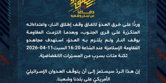 دفاعًا عن لبنان وشعبه، وردًّا على خرق العدوّ لاتفاق وقف إطلاق النار، واعتداءاته المتكرّرة على قرى الجنوب، وبعدما التزمت المقاومة بوقف النار ولم يلتزم به العدوّ، استهدف مجاهدو المُقاومة الإسلاميّة عند السّاعة 16:20 السبت 11-04-2026 ثكنة متات بسربٍ من المسيّرات الانقضاضيّة.
