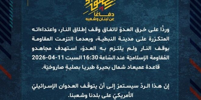 دفاعًا عن لبنان وشعبه، وردًّا على خرق العدوّ لاتفاق وقف إطلاق النار، واعتداءاته المتكرّرة على مدينة النبطية، وبعدما التزمت المقاومة بوقف النار ولم يلتزم به العدوّ، استهدف مجاهدو المُقاومة الإسلاميّة عند السّاعة 16:30 السبت 11-04-2026 قاعدة عميعاد شمال بحيرة طبريا بصليةٍ صاروخيّة.