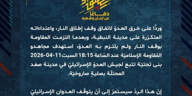 دفاعًا عن لبنان وشعبه، وردًّا على خرق العدوّ لاتفاق وقف إطلاق النار، واعتداءاته المتكرّرة على مدينة النبطية، وبعدما التزمت المقاومة بوقف النار ولم يلتزم به العدوّ، استهدف مجاهدو المُقاومة الإسلاميّة عند السّاعة 18:15 السبت 11-04-2026 بنى تحتيّة تتبع لجيش العدوّ الإسرائيليّ في مدينة صفد المحتلّة بصليةٍ صاروخيّة.
