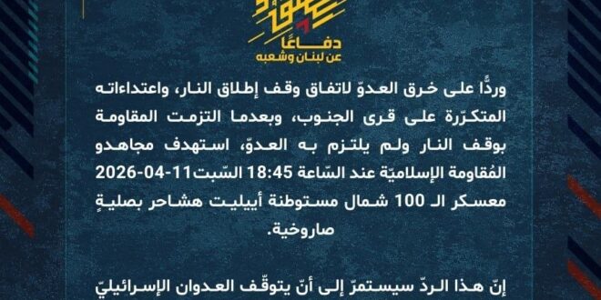دفاعًا عن لبنان وشعبه، وردًّا على خرق العدوّ لاتفاق وقف إطلاق النار، واعتداءاته المتكرّرة على قرى الجنوب، وبعدما التزمت المقاومة بوقف النار ولم يلتزم به العدوّ، استهدف مجاهدو المُقاومة الإسلاميّة عند السّاعة 18:45 السّبت 11-04-2026 معسكر الـ 100 شمال مستوطنة أييليت هشاحر بصليةٍ صاروخية.