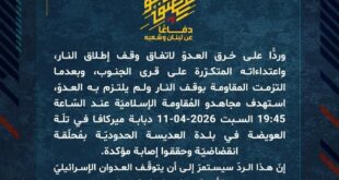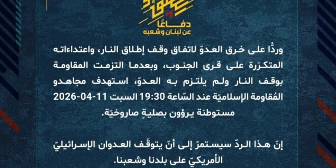 دفاعًا عن لبنان وشعبه، وردًّا على خرق العدوّ لاتفاق وقف إطلاق النار، واعتداءاته المتكرّرة على قرى الجنوب، وبعدما التزمت المقاومة بوقف النار ولم يلتزم به العدوّ، استهدف مجاهدو المُقاومة الإسلاميّة عند السّاعة 19:30 السبت 11-04-2026 مستوطنة يرؤون بصليةٍ صاروخيّة.