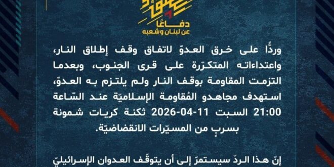 دفاعًا عن لبنان وشعبه، وردًّا على خرق العدوّ لاتفاق وقف إطلاق النار، واعتداءاته المتكرّرة على قرى الجنوب، وبعدما التزمت المقاومة بوقف النار ولم يلتزم به العدوّ، استهدف مجاهدو المُقاومة الإسلاميّة عند السّاعة 21:00 السبت 11-04-2026 ثكنة كريات شمونة بسربٍ من المسيّرات الانقضاضيّة.