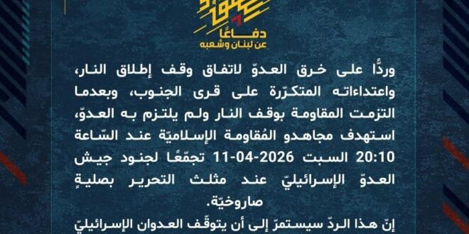دفاعًا عن لبنان وشعبه، وردًّا على خرق العدوّ لاتفاق وقف إطلاق النار، واعتداءاته المتكرّرة على قرى الجنوب، وبعدما التزمت المقاومة بوقف النار ولم يلتزم به العدوّ، استهدف مجاهدو المُقاومة الإسلاميّة عند السّاعة 20:10 السبت 11-04-2026 تجمّعًا لجنود جيش العدوّ الإسرائيليّ عند مثلث التحرير بصليةٍ صاروخيّة.