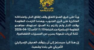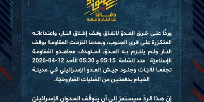 دفاعًا عن لبنان وشعبه، وردًّا على خرق العدوّ لاتفاق وقف إطلاق النار، واعتداءاته المتكرّرة على قرى الجنوب، وبعدما التزمت المقاومة بوقف النار ولم يلتزم به العدوّ، استهدف مجاهدو المُقاومة الإسلاميّة عند السّاعة 05:15 و05:30 الأحد 12-04-2026 تجمّعا لآليّات وجنود جيش العدو الإسرائيلي في مدينة الخيام بدفعتين من الصّليات الصّاروخيّة.