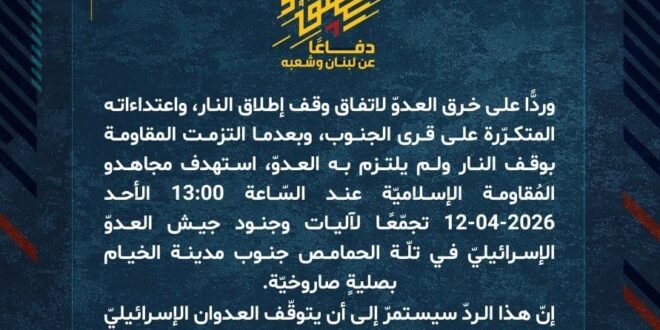 دفاعًا عن لبنان وشعبه، وردًّا على خرق العدوّ لاتفاق وقف إطلاق النار، واعتداءاته المتكرّرة على قرى الجنوب، وبعدما التزمت المقاومة بوقف النار ولم يلتزم به العدوّ، استهدف مجاهدو المُقاومة الإسلاميّة عند السّاعة 13:00 الأحد 12-04-2026 تجمّعًا لآليات وجنود جيش العدوّ الإسرائيليّ في تلّة الحمامص جنوب مدينة الخيام بصليةٍ صاروخيّة.