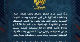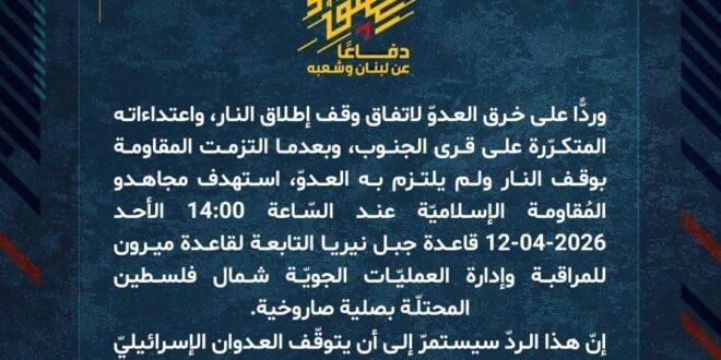 دفاعًا عن لبنان وشعبه، وردًّا على خرق العدوّ لاتفاق وقف إطلاق النار، واعتداءاته المتكرّرة على قرى الجنوب، وبعدما التزمت المقاومة بوقف النار ولم يلتزم به العدوّ، استهدف مجاهدو المُقاومة الإسلاميّة عند السّاعة 14:00 الأحد 12-04-2026 قاعدة جبل نيريا التابعة لقاعدة ميرون للمراقبة وإدارة العمليّات الجويّة شمال فلسطين المحتلّة بصلية صاروخية.