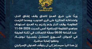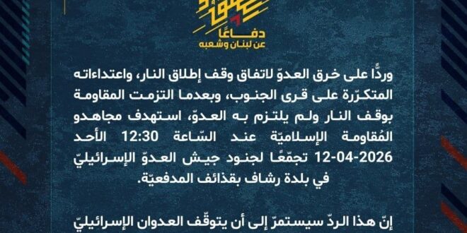 دفاعًا عن لبنان وشعبه، وردًّا على خرق العدوّ لاتفاق وقف إطلاق النار، واعتداءاته المتكرّرة على قرى الجنوب، وبعدما التزمت المقاومة بوقف النار ولم يلتزم به العدوّ، استهدف مجاهدو المُقاومة الإسلاميّة عند السّاعة 12:30 الأحد 12-04-2026 تجمّعًا لجنود جيش العدوّ الإسرائيليّ في بلدة رشاف بقذائف المدفعيّة.