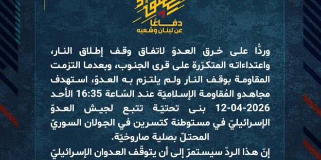 دفاعًا عن لبنان وشعبه، وردًّا على خرق العدوّ لاتفاق وقف إطلاق النار، واعتداءاته المتكرّرة على قرى الجنوب، وبعدما التزمت المقاومة بوقف النار ولم يلتزم به العدوّ، استهدف مجاهدو المُقاومة الإسلاميّة عند السّاعة 16:35 الأحد 12-04-2026 بنى تحتيّة تتبع لجيش العدوّ الإسرائيليّ في مستوطنة كتسرين في الجولان السوريّ المحتلّ بصلية صاروخيّة.