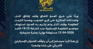 دفاعًا عن لبنان وشعبه، وردًّا على خرق العدوّ لاتفاق وقف إطلاق النار، واعتداءاته المتكرّرة على قرى الجنوب، وبعدما التزمت المقاومة بوقف النار ولم يلتزم به العدوّ، استهدف مجاهدو المُقاومة الإسلاميّة عند السّاعة 12:50 الأحد 12-04-2026 تجمّعًا لجنود وآليات جيش العدوّ الإسرائيليّ عند مثلث التحرير في مدينة بنت جبيل بصلية صاروخيّة.