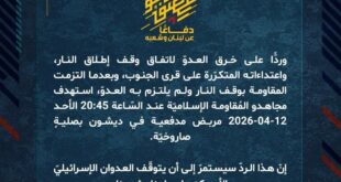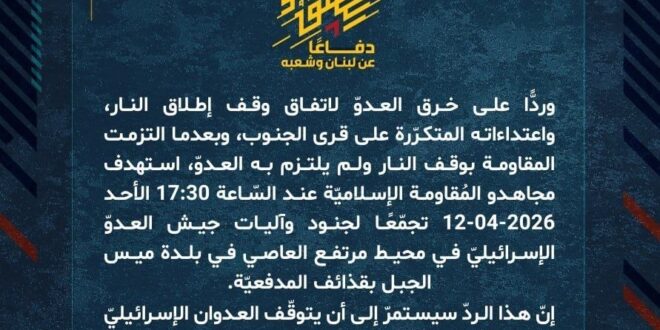 دفاعًا عن لبنان وشعبه، وردًّا على خرق العدوّ لاتفاق وقف إطلاق النار، واعتداءاته المتكرّرة على قرى الجنوب، وبعدما التزمت المقاومة بوقف النار ولم يلتزم به العدوّ، استهدف مجاهدو المُقاومة الإسلاميّة عند السّاعة 17:30 الأحد 12-04-2026 تجمّعًا لجنود وآليات جيش العدوّ الإسرائيليّ في محيط مرتفع العاصي في بلدة ميس الجبل بقذائف المدفعيّة.