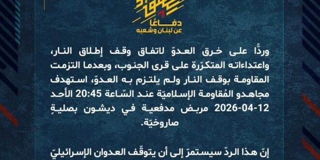 دفاعًا عن لبنان وشعبه، وردًّا على خرق العدوّ لاتفاق وقف إطلاق النار، واعتداءاته المتكرّرة على قرى الجنوب، وبعدما التزمت المقاومة بوقف النار ولم يلتزم به العدوّ، استهدف مجاهدو المُقاومة الإسلاميّة عند السّاعة 20:45 الأحد 12-04-2026 مربض مدفعية في ديشون بصليةٍ صاروخيّة.