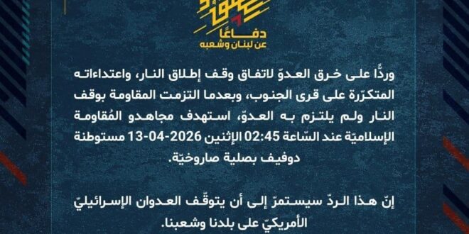 دفاعًا عن لبنان وشعبه، وردًّا على خرق العدوّ لاتفاق وقف إطلاق النار، واعتداءاته المتكرّرة على قرى الجنوب، وبعدما التزمت المقاومة بوقف النار ولم يلتزم به العدوّ، استهدف مجاهدو المُقاومة الإسلاميّة عند السّاعة 02:45 الإثنين 13-04-2026 مستوطنة دوفيف بصليةٍ صاروخيّة.