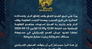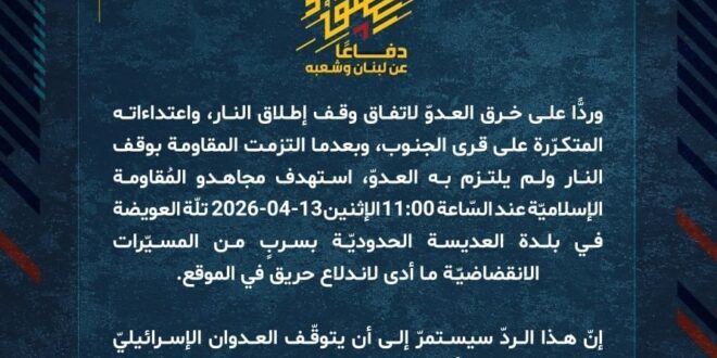 دفاعًا عن لبنان وشعبه، وردًّا على خرق العدوّ لاتفاق وقف إطلاق النار، واعتداءاته المتكرّرة على قرى الجنوب، وبعدما التزمت المقاومة بوقف النار ولم يلتزم به العدوّ، استهدف مجاهدو المُقاومة الإسلاميّة عند السّاعة 11:00 الإثنين 13-04-2026 تلّة العويضة في بلدة العديسة الحدوديّة بسربٍ من المسيّرات الانقضاضيّة ما أدى لاندلاع حريق في الموقع.