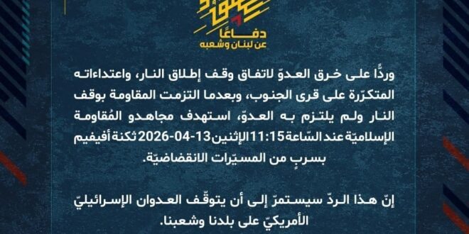 دفاعًا عن لبنان وشعبه، وردًّا على خرق العدوّ لاتفاق وقف إطلاق النار، واعتداءاته المتكرّرة على قرى الجنوب، وبعدما التزمت المقاومة بوقف النار ولم يلتزم به العدوّ، استهدف مجاهدو المُقاومة الإسلاميّة عند السّاعة 11:15 الإثنين 13-04-2026 ثكنة أفيفيم بسربٍ من المسيّرات الانقضاضيّة.