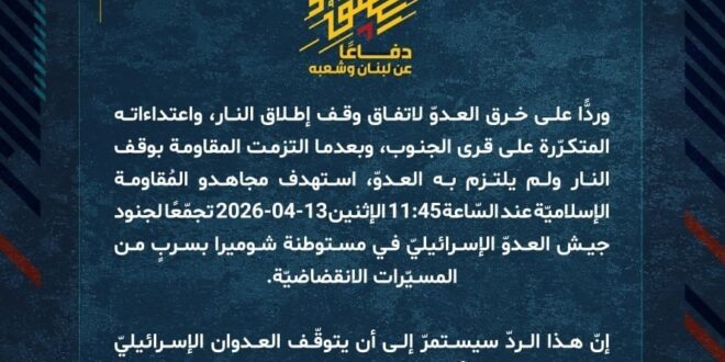 دفاعًا عن لبنان وشعبه، وردًّا على خرق العدوّ لاتفاق وقف إطلاق النار، واعتداءاته المتكرّرة على قرى الجنوب، وبعدما التزمت المقاومة بوقف النار ولم يلتزم به العدوّ، استهدف مجاهدو المُقاومة الإسلاميّة عند السّاعة 11:45 الإثنين 13-04-2026 تجمّعًا لجنود جيش العدوّ الإسرائيليّ في مستوطنة شوميرا بسربٍ من المسيّرات الانقضاضيّة.