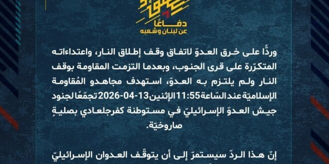 دفاعًا عن لبنان وشعبه، وردًّا على خرق العدوّ لاتفاق وقف إطلاق النار، واعتداءاته المتكرّرة على قرى الجنوب، وبعدما التزمت المقاومة بوقف النار ولم يلتزم به العدوّ، استهدف مجاهدو المُقاومة الإسلاميّة عند السّاعة 11:55 الإثنين 13-04-2026 تجمّعًا لجنود جيش العدوّ الإسرائيليّ في مستوطنة كفرجلعادي بصليةٍ صاروخيّة.