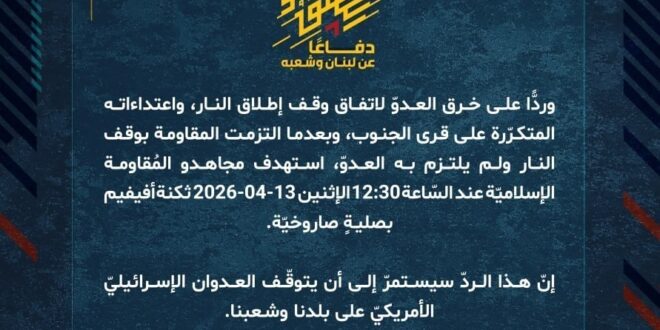 دفاعًا عن لبنان وشعبه، وردًّا على خرق العدوّ لاتفاق وقف إطلاق النار، واعتداءاته المتكرّرة على قرى الجنوب، وبعدما التزمت المقاومة بوقف النار ولم يلتزم به العدوّ، استهدف مجاهدو المُقاومة الإسلاميّة عند السّاعة 12:30 الإثنين 13-04-2026 ثكنة أفيفيم بصليةٍ صاروخيّة.