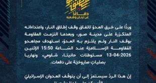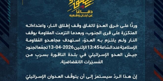 دفاعًا عن لبنان وشعبه، وردًّا على خرق العدوّ لاتفاق وقف إطلاق النار، واعتداءاته المتكرّرة على قرى الجنوب، وبعدما التزمت المقاومة بوقف النار ولم يلتزم به العدوّ، استهدف مجاهدو المُقاومة الإسلاميّة عند السّاعة 13:45 الإثنين 13-04-2026 تجمّعا لجنود جيش العدو الإسرائيلي في بلدة الناقورة بسربٍ من المُسيّرات الانقضاضيّة.