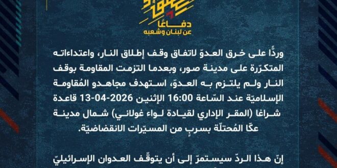 دفاعًا عن لبنان وشعبه، وردًّا على خرق العدوّ لاتفاق وقف إطلاق النار، واعتداءاته المتكرّرة على مدينة صور، وبعدما التزمت المقاومة بوقف النار ولم يلتزم به العدوّ، استهدف مجاهدو المُقاومة الإسلاميّة عند السّاعة 16:00 الإثنين 13-04-2026 قاعدة شراغا (المقر الإداري لقيادة لواء غولاني) شمال مدينة عكّا المُحتلّة بسربٍ من المسيّرات الانقضاضيّة.