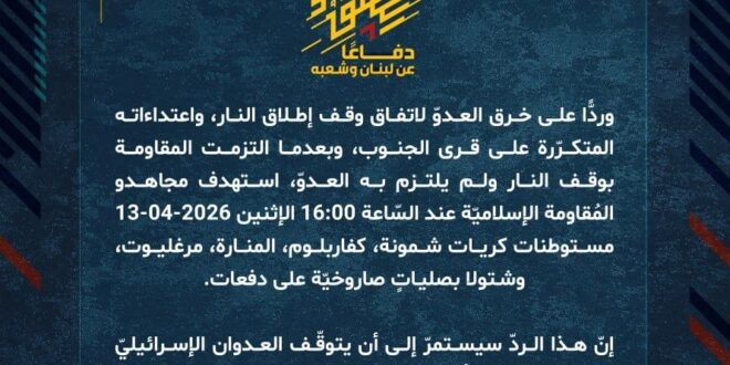 دفاعًا عن لبنان وشعبه، وردًّا على خرق العدوّ لاتفاق وقف إطلاق النار، واعتداءاته المتكرّرة على قرى الجنوب، وبعدما التزمت المقاومة بوقف النار ولم يلتزم به العدوّ، استهدف مجاهدو المُقاومة الإسلاميّة عند السّاعة 16:00 الإثنين 13-04-2026 مستوطنات كريات شمونة، كفاربلوم، المنارة، مرغليوت، وشتولا بصلياتٍ صاروخيّة على دفعات.