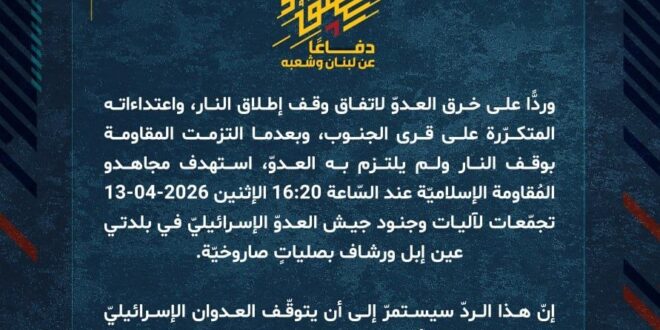 دفاعًا عن لبنان وشعبه، وردًّا على خرق العدوّ لاتفاق وقف إطلاق النار، واعتداءاته المتكرّرة على قرى الجنوب، وبعدما التزمت المقاومة بوقف النار ولم يلتزم به العدوّ، استهدف مجاهدو المُقاومة الإسلاميّة عند السّاعة 16:20 الإثنين 13-04-2026 تجمّعات لآليات وجنود جيش العدوّ الإسرائيليّ في بلدتي عين إبل ورشاف بصلياتٍ صاروخيّة.