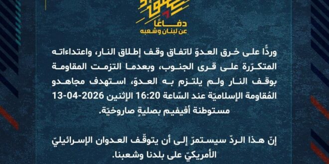 دفاعًا عن لبنان وشعبه، وردًّا على خرق العدوّ لاتفاق وقف إطلاق النار، واعتداءاته المتكرّرة على قرى الجنوب، وبعدما التزمت المقاومة بوقف النار ولم يلتزم به العدوّ، استهدف مجاهدو المُقاومة الإسلاميّة عند السّاعة 16:20 الإثنين 13-04-2026 مستوطنة أفيفيم بصليةٍ صاروخيّة.