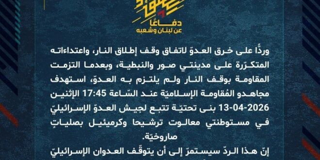 دفاعًا عن لبنان وشعبه، وردًّا على خرق العدوّ لاتفاق وقف إطلاق النار، واعتداءاته المتكرّرة على مدينتي صور والنبطية، وبعدما التزمت المقاومة بوقف النار ولم يلتزم به العدوّ، استهدف مجاهدو المُقاومة الإسلاميّة عند السّاعة 17:45 الإثنين 13-04-2026 بنى تحتيّة تتبع لجيش العدوّ الإسرائيليّ في مستوطنتي معالوت ترشيحا وكرميئيل بصلياتٍ صاروخيّة.