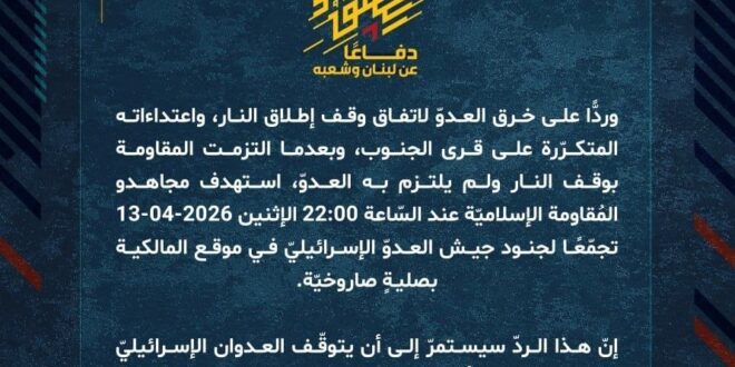 دفاعًا عن لبنان وشعبه، وردًّا على خرق العدوّ لاتفاق وقف إطلاق النار، واعتداءاته المتكرّرة على قرى الجنوب، وبعدما التزمت المقاومة بوقف النار ولم يلتزم به العدوّ، استهدف مجاهدو المُقاومة الإسلاميّة عند السّاعة 22:00 الإثنين 13-04-2026 تجمّعًا لجنود جيش العدوّ الإسرائيليّ في موقع المالكية بصليةٍ صاروخيّة.