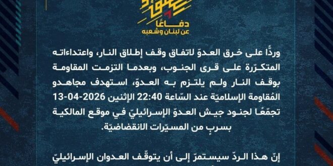 دفاعًا عن لبنان وشعبه، وردًّا على خرق العدوّ لاتفاق وقف إطلاق النار، واعتداءاته المتكرّرة على قرى الجنوب، وبعدما التزمت المقاومة بوقف النار ولم يلتزم به العدوّ، استهدف مجاهدو المُقاومة الإسلاميّة عند السّاعة 22:40 الإثنين 13-04-2026 تجمّعًا لجنود جيش العدوّ الإسرائيليّ في موقع المالكية بسربٍ من المسيّرات الانقضاضيّة.