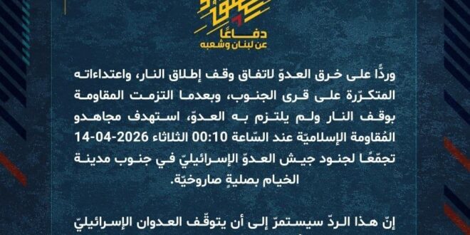 دفاعًا عن لبنان وشعبه، وردًّا على خرق العدوّ لاتفاق وقف إطلاق النار، واعتداءاته المتكرّرة على قرى الجنوب، وبعدما التزمت المقاومة بوقف النار ولم يلتزم به العدوّ، استهدف مجاهدو المُقاومة الإسلاميّة عند السّاعة 00:10 الثلاثاء 14-04-2026 تجمّعًا لجنود جيش العدوّ الإسرائيليّ في جنوب مدينة الخيام بصليةٍ صاروخيّة.