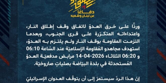 دفاعًا عن لبنان وشعبه، وردًّا على خرق العدوّ لاتفاق وقف إطلاق النار، واعتداءاته المتكرّرة على قرى الجنوب، وبعدما التزمت المقاومة بوقف النار ولم يلتزم به العدوّ، استهدف مجاهدو المُقاومة الإسلاميّة عند السّاعة 06:10 و 06:20 الثلاثاء 14-04-2026 مرابض مدفعيّة العدوّ المُستحدثة في بلدة البيّاضة بصلياتٍ صاروخيّة.
